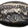 Nόμισμα από ήλεκτρο (απολιθωμένο ρετσίνι) Στην μια όψη παριστάνεται ένα ελάφι που βόσκει Στην άλλη όψη υπάρχουν εγχάρακτα τετράγωνα που περιέχουν ακανόνιστα σχήματα .